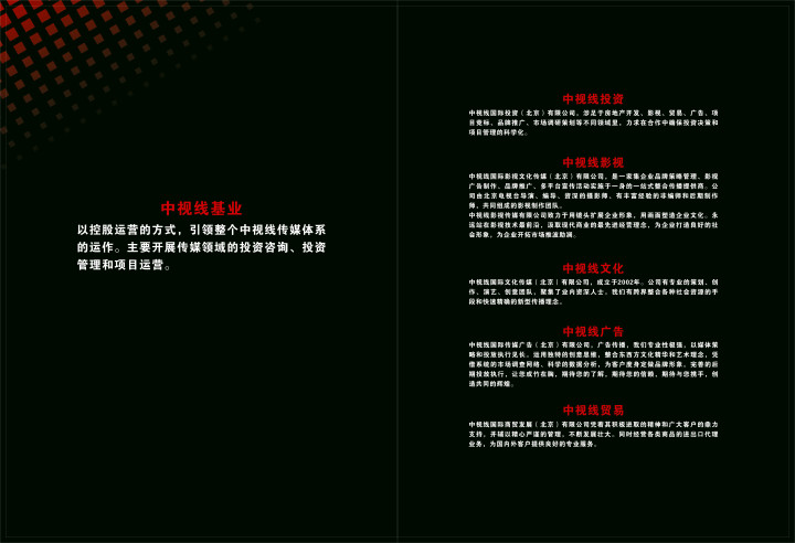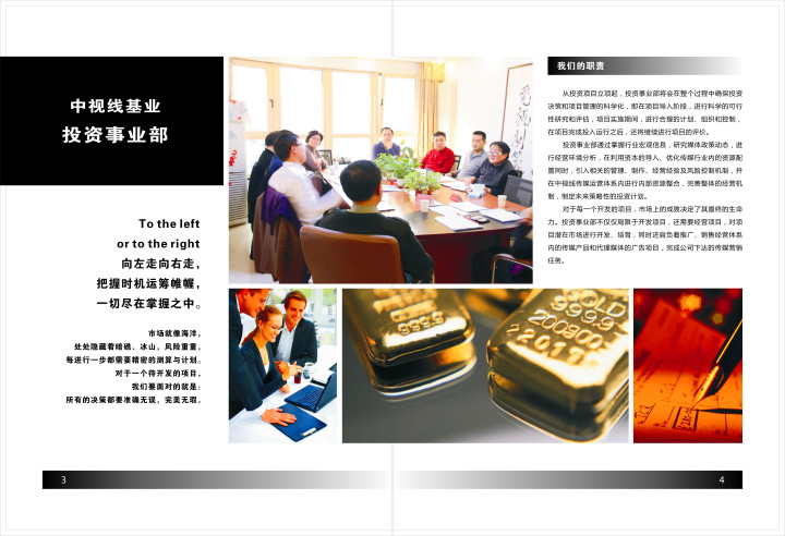 中视线国际投资(北京)有限公司,在房地产开发、影视、贸易、广告、项目竞标、品牌推广、市场调研策划等不同领域里,力求在合作中确保投资决策和项目管理的科学化,在项目导入阶段,进行科学的可行性研究和评估;项目实施期间,进行合理的计划、组织和控制。在项目完成投入运行后,还将继续进行项目的评价;通过掌握行业宏观信息,研究媒体政策动态,进行经营环境分析。在利用资本的导入、优化资源配置的同时,引入相关的管理、制作、经营经验及风险控制机制...